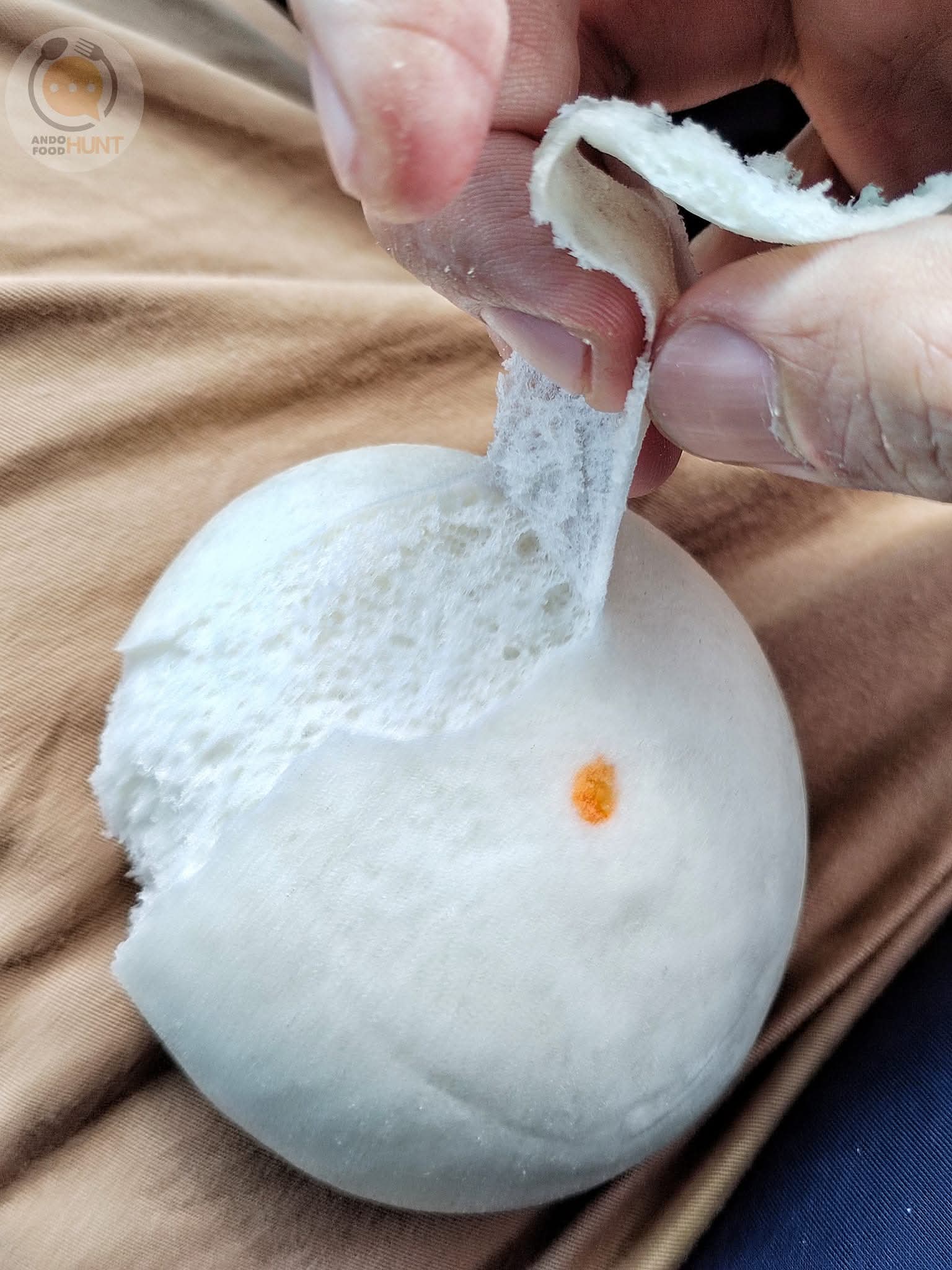 功底很好,包子表層的薄膜輕輕一拉就能漂亮的撕開,留下內裏紋路整潔的包子皮。