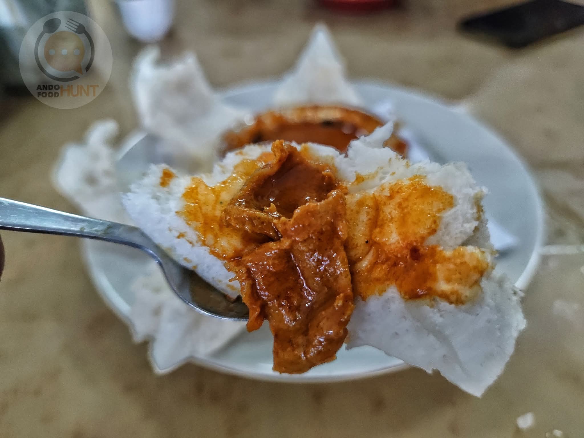 醮著濃郁鹹香卻夾帶溫和辣勁的咖哩豬肉一起食用,風味絕佳。同行家老也一致好評。