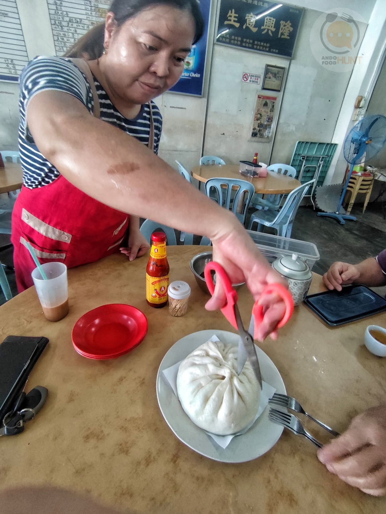 咖哩豬肉包上桌,店員為我們將其剪開。