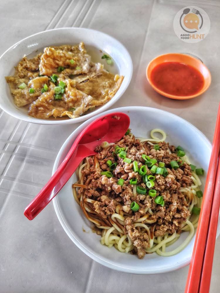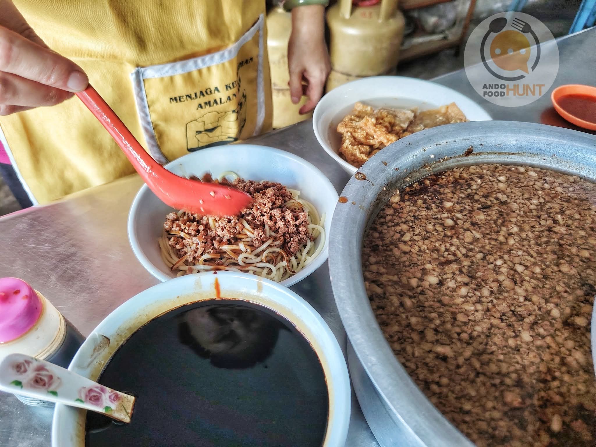 從釀料的材料,到麵條上的配料,很容易就看見客家人飲食的痕跡。這裡也不例外。這裡的麵條不採用居鑾的永珍麵,而是採用店家隔壁福建人製作的黃麵條,醬汁作為基地,倒入麵條再鋪撒上肉碎。拌一拌就是一碗好吃的客家肉碎麵。
