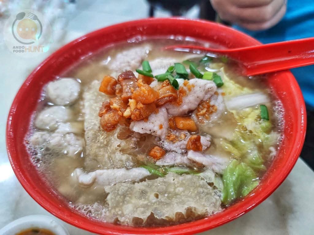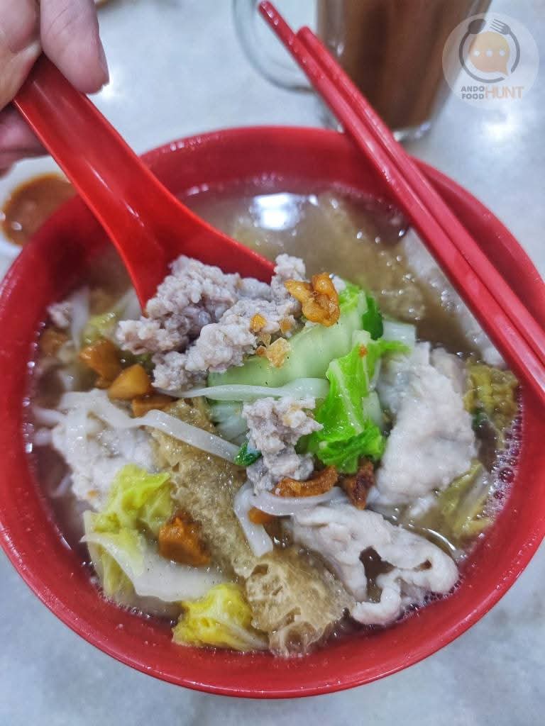 七小時以上的無味精湯頭,熬製出食材精華帶來的鮮濃清甜,喝起來回甘卻不膩口,在配以肉碎片,豬肉丸,豬皮及豬肝等豐富配料,再配上細滑順口且吸附了湯汁的粿條一起食用,儘管稍作改良,但卻解了我對雪隆一派豬肉粉的饞念。